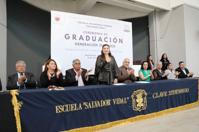 Zacatecas, Zac.- En representación del gobernador David Monreal Ávila, la secretaria de Educación, Gabriela Pinedo Morales, entregó el certificado de conclusión de estudios a 220 jóvenes de tercer grado de la Escuela Secundaria Federal número 2 Salvador Vidal, ubicada en la capital de Zacatecas.