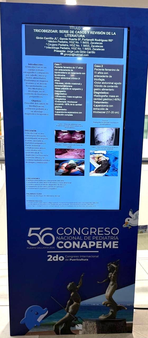 Puerto Vallarta, Jalisco, 23 de Abril de 2026. La Unidad Académica de Enfermería de la Universidad Autónoma de Zacatecas participó en el 56 Congreso Nacional de Pediatría CONAPEME y en el 2º Congreso Internacional de Puericultura con la presentación del trabajo "Tricobezoar: serie de casos y revisión de la literatura".